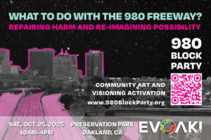 The 980 Block Party is a landmark community festival that mobilizes local residents through art, storytelling, and participatory design to reimagine the future of the I-980 corridor with an equitable development lens. The event builds on West Oakland’s cultural legacy with a commitment to policy change around comprehensive creative community development. Learn more at: https://www.980blockparty.org/.